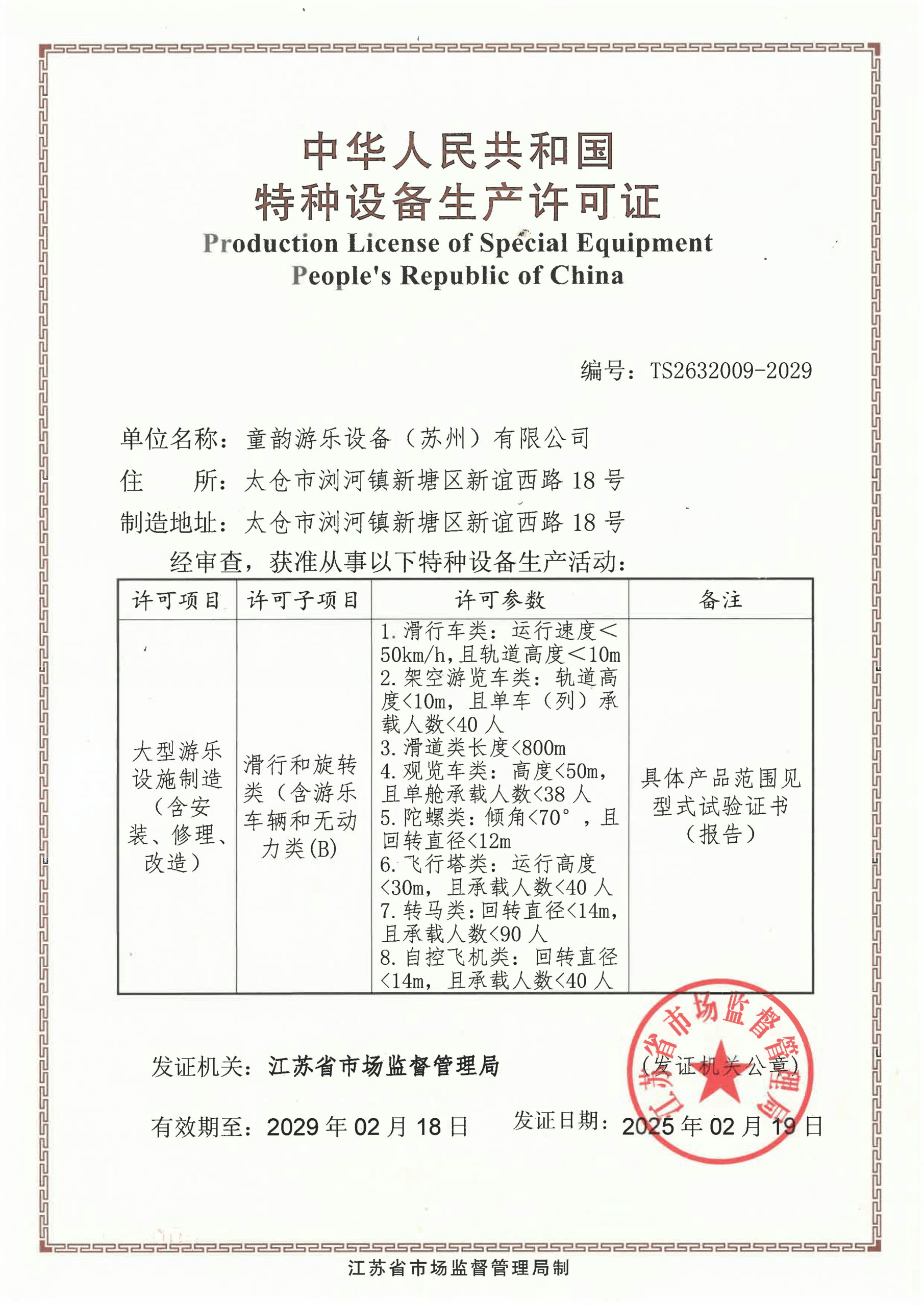 Funlandia holds the Special Equipment Design, Manufacture, Installation and Maintenance License under PRC regulatory standards, demonstrating fully qualified capability to produce and install commercially reliable and certified attractions.