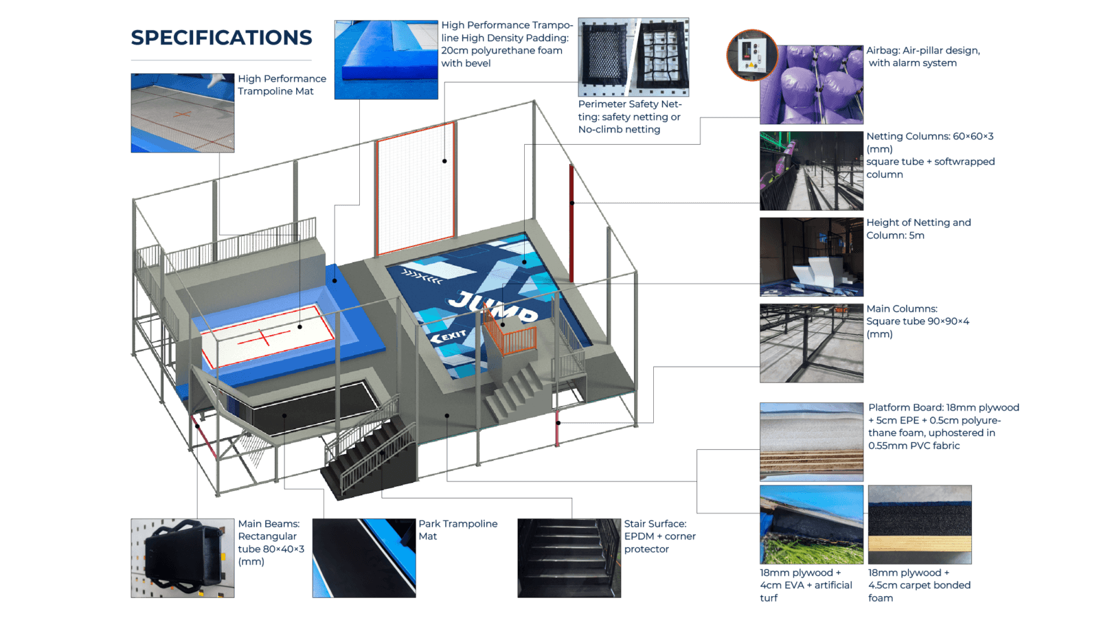 We use high-density foam padding and durable trampoline fabrics that offer better wear resistance and shape retention over time. These materials are selected to reduce fatigue, extend service life, and maintain consistent performance under heavy loads.