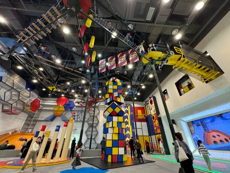 Amidst a symphony of colors and lines, we have created an unprecedented sports playground—the Secrets of Mondrian Grids. This expansive 3000+ square meter family entertainment center successfully launched in Shanghai in 2023. Located within a major shopping mall, it offers convenient access and ample parking, perfectly meeting families’ one-stop fun needs. The entire park is divided into multiple zones to cater to children of different age groups, which includes Honeycomb Net Courses, Stainless Steel Spiral Slide, Grid Games, Rope Courses, Jump Grid Climbing Cube, trampoline zones, climbing areas, and interactive zones. It offers a plethora of unique experiences, allowing kids to engage in physical activities while having fun.