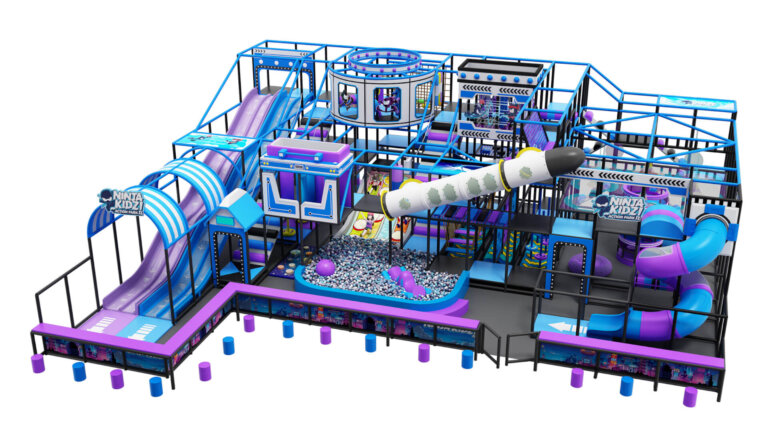 NINJA KIDZI ACTION PARK features a vibrant blue and purple color scheme, creating a lively and futuristic atmosphere that immediately captures children’s attention. The park is equipped with a wide range of attractions, including a soft play Indoor Playground, Super Runio adventure zone, Junior Ninja Warrior challenge, exciting slides, and a colorful ball pool. Each element is carefully designed to provide fun and safe experiences for children of all ages.