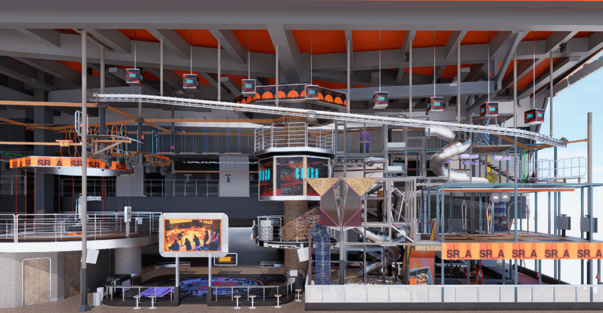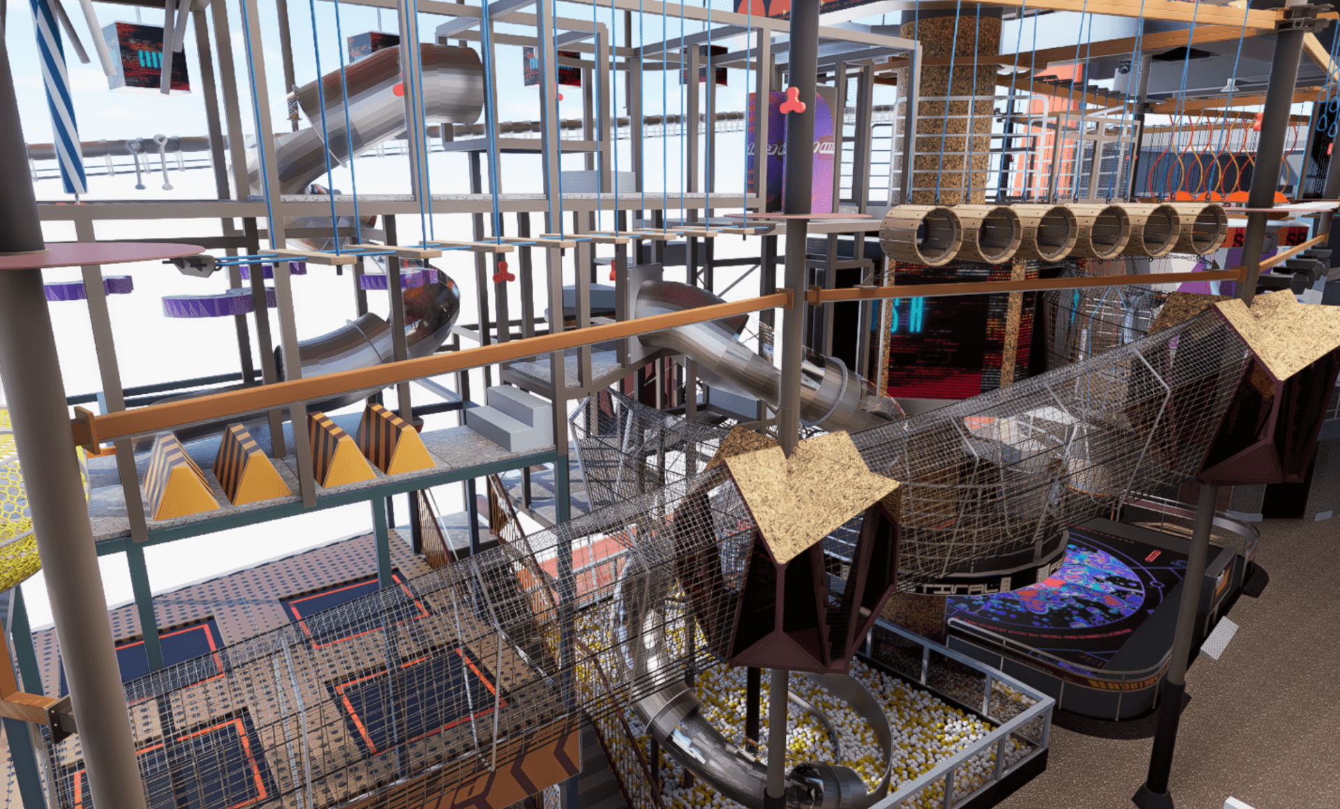 Located in Shenzhen, this Funlandia project features a comprehensive sports and adventure park combining Rope Courses, Net Attactions, Trampoline Park and other interactive play attractions in a vertical space. Designed for all age groups, the space promotes active fun, fitness, and teamwork through engaging Adventure Play elements.